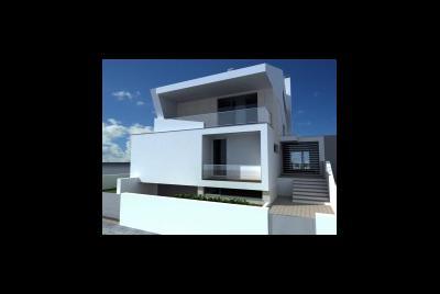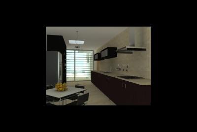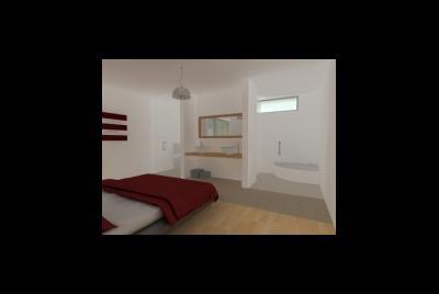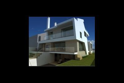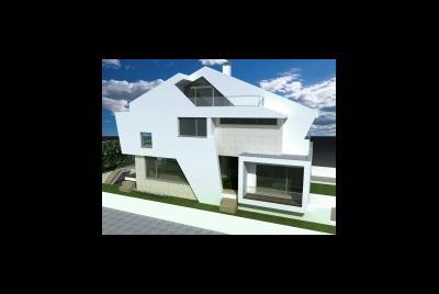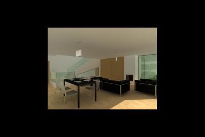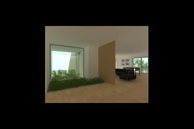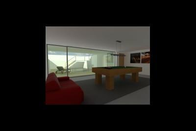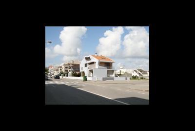 Imagem fotorealista da proposta para o lote 1 da Quinta da Barra, situado na Praia da Barra em Ilhavo. Trata-se de uma habitação de programa habitacional completo distribuido por dois pisos, cave, e aproveitamentpo do desvão de telhado. Com um perfil obrigatório no loteamento, a solução tem diversos elementos inovadores.