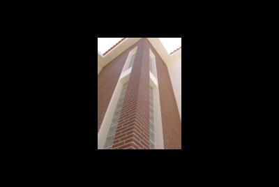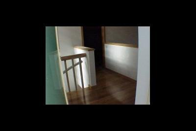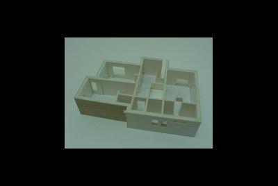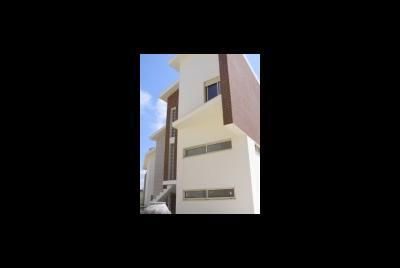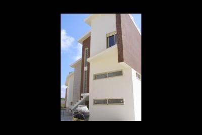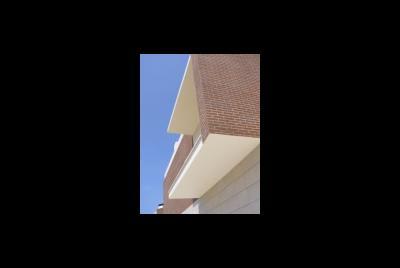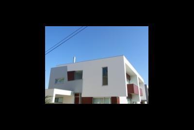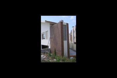 O terreno devido à sua forma muito peculiar, em gaveto, mas com um angulo muito acentuado, deu origem ao remate que se vê na foto , onde se localizou a sala com pé direito duplo a junção das duas paredes é feita por tijolo de vidro. Tal origina um feixe de luz que incide sobre a sala e corta-a atravessando todo o espaço. O material utilizado foi além da pintura em tons muito próximos do branco, temos o capeamento a tijoleira de fita de cor vermelho flamejado de castanho. O pormenor de remate do gaveto ajuda a tornar a solução peculiar. Foto tirada sobre o gaveto do terreno. Ucha, Carocho, Quinta do Picado, Freguesia de Aradas, Aveiro Promotor Habitaveiro Construções Urbanas L.da Construtor Francisco Pimentel e Irmão L.da