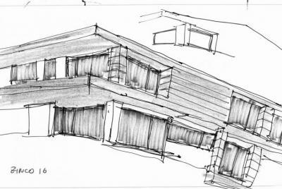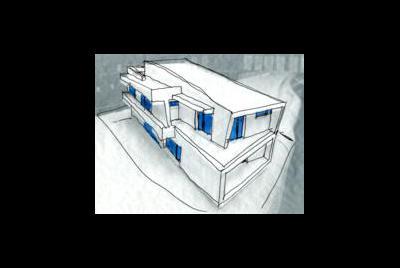 Neste caso temos uma solução de gaveto em terreno estreito e que gemina parcialmente com o terreno vizinho, em termos de programa este tem a sua peculiaridade, o espaço principal é multifunções e amplo, onde se pode fazer as refeições, trabalhar, brincar, e é também espaço de biblioteca, o espaço seguinte em ordem de grandeza e importância é a cozinha com espaço para refeições, seguindo-se os quartos, ficando em último lugar além dos serviços também a sala formal, isto é a sala dos “bibelôs”.