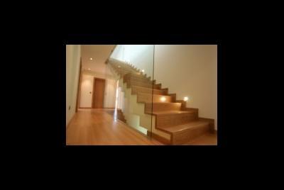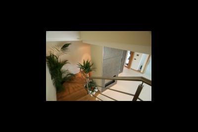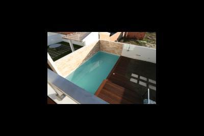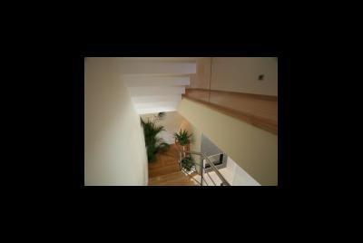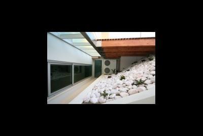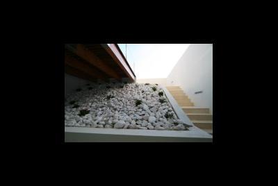 é perceptivel desta foto as vistas sobre o jardim do pateo interior (logradouro), o objectivo é desde a chegada do carro ter logo uma vista agradável dos espaços, deixando assim a garagem de ser um espaço residual e acessório da habitação. Sala de banho situada na cave, este espaço é tratado como um espaço sala de banho com uma área considerável , tem por objectivo o uso e apoio da piscina, é portanto a casa de banho com maior uso social. Arquitectura - José Vitória Arquitectos