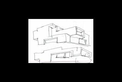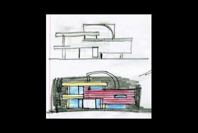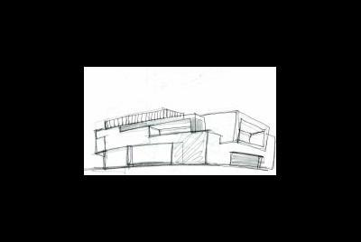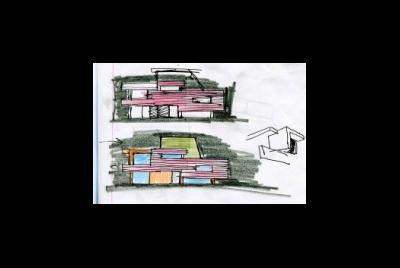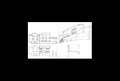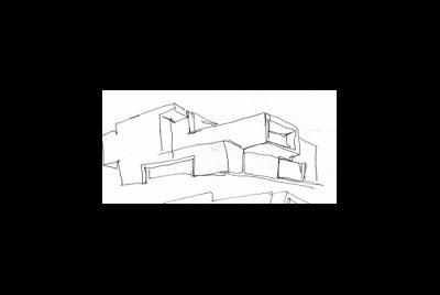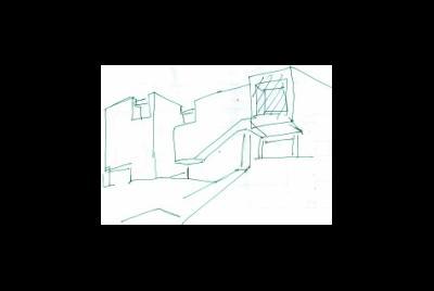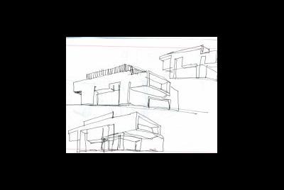 Do volume que faz a frente com um piso só e com uma forma de curva para resolver a morfologia peculiar do terreno na sua ligação com o arruamento, e também com as ruas que confluem ao terreno e que necessitam se ser rematadas por desenho. A sul privilegiou-se a cozinha que frui também do nascente e a sala a seguir vai de sul a poente, o poente neste caso não é muito problemático pois está prtegido por volume e plano paralelo aos raios poente do sol.
