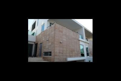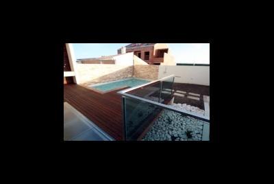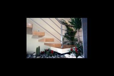 A sala de banho do piso térreo tem dois tipos de luz natural, uma tangente com o piso e a outro zenital no centro do tecto, os materiais são o vidro e a pedra natural. A cozinha de cores muito claras quase branca tem vistas para a rua e simultaneamente para o pateo interior do lote onde se situam a piscina, barbecue, jardim e pisos de deck extensos um deles destinado às refeições no exterior e o outro destinado a solarium.