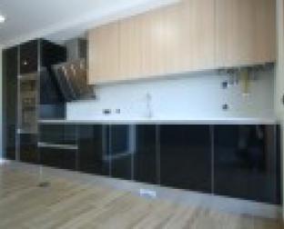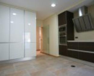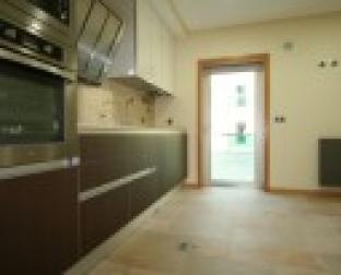 Cozinha da fracção N do Edifício Praia-Oeste. No pavimento um cerâmico da Margrês de tons Beije e mesclado com cinza.