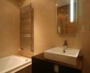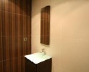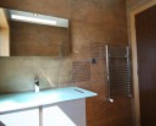 Bloco Habitacional Praia Oeste, casa de banho do fracção o . Os cerâmicos rectificados com texturas semelhantes mas com cores diferenciadas.
